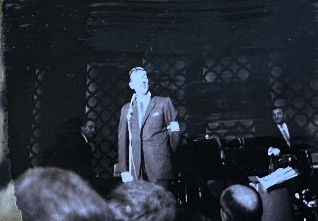 - Microphone: The person is standing in front of an old-fashioned microphone, which could help date the photo more precisely within the 1940s.