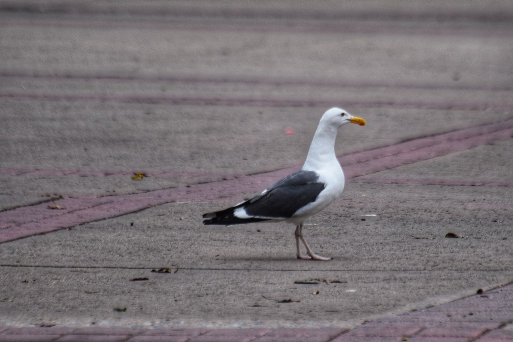 Nearby, a solitary gull paced around, looking for food. It managed to snag a few snacks from passersby before pausing to pose for me. I was pleased to capture that image, especially since I wasn’t sure which gull species it was. Later, I identified it as a Western Gull and logged it in my eBird checklist. It’s only the second one I’ve seen this year; later, at the hotel, I spotted several more.