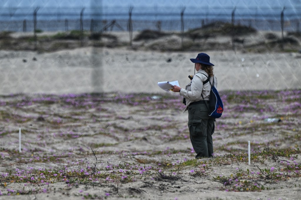 Local naturalists were doing a health check of the nesting grounds, slowly walking back and forth in a grid pattern designed to cover the entire fenced-off nesting area. The terns were not happy and formed noisy clouds, dive-bombing the naturalists in protest. I tried to capture this in photos but ended up just taking a picture of the poor naturalists.