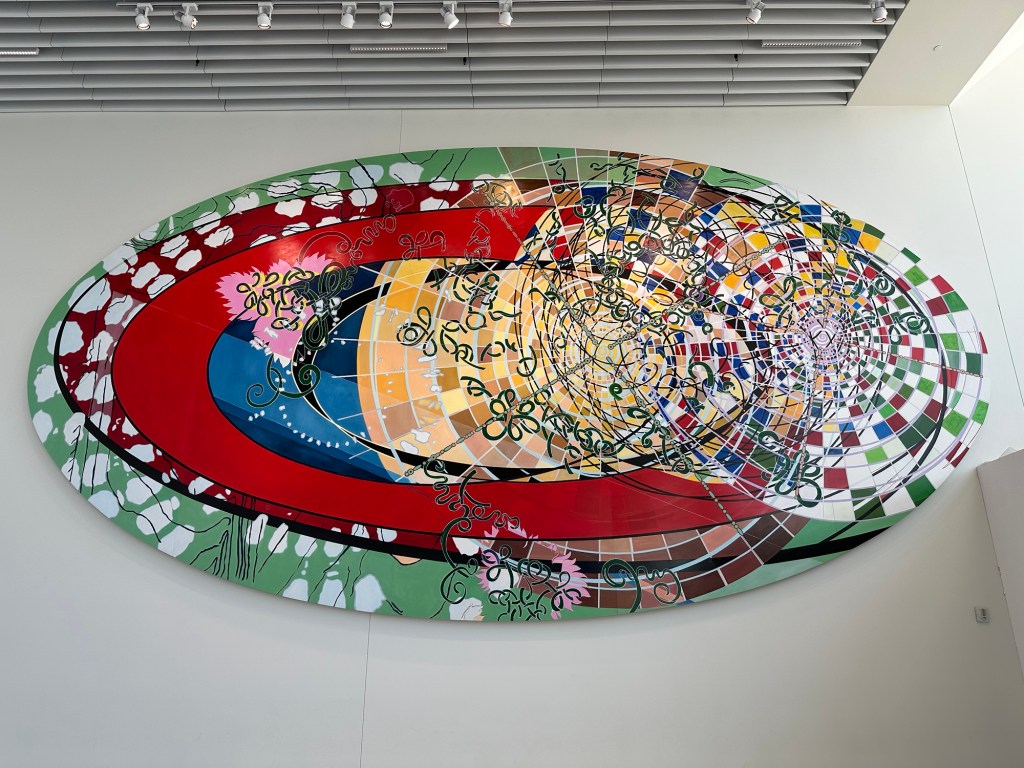 On Level 3, near Delta’s security boarding gates, I came across another striking art installation: a massive oval painting titled Just What is Your Position by Renee Petropoulos. It’s a kaleidoscopic vision of color and movement. I stood there for nearly 10 minutes, long enough that I half expected security to start watching me.