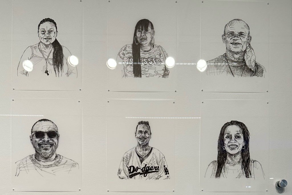 365 Days of Voters was conceived during Aschheim’s 2019–2020 residency as a Creative Strategist with the LA County Registrar-Recorder/County Clerk. She sketched people from all walks of life, at the zoo, Pride events, colleges, resource fairs, naturalization ceremonies, polling stations, and more, capturing both their likenesses and their motivations to vote. The installation feels like a cross section of Los Angeles itself, and I think it’s a perfect way to welcome visitors.