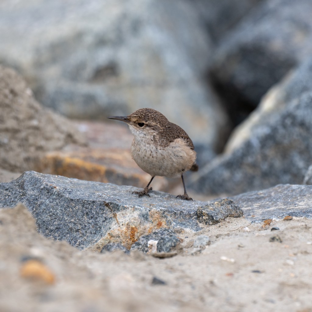 The Rock Wren (Salpinctes obsoletus) is a pale, fairly small bird, about the size of a sparrow. It has a slender bill that curves slightly downward and is typically found in rocky arid areas across the western U.S. I’ve looked for them before in canyonlands and desert scrub, but never expected to find one near the beach. These birds feed on insects and spiders and get most of the water they need from their food.